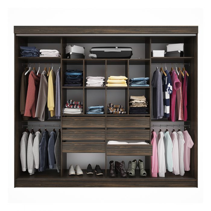 • Si buscás espacio y estilo en un solo lugar, nuestro Ropero Reflex de 4 puertas corredizas es la elección perfecta. Con 6 cajones y 10 estantes, tendrás todo el espacio necesario para organizar tus pertenencias. El diseño con perfilería lateral de puertas y percheros en aluminio aportan un toque distintivo que convertirá a este ropero en el centro de atención de tu habitación.